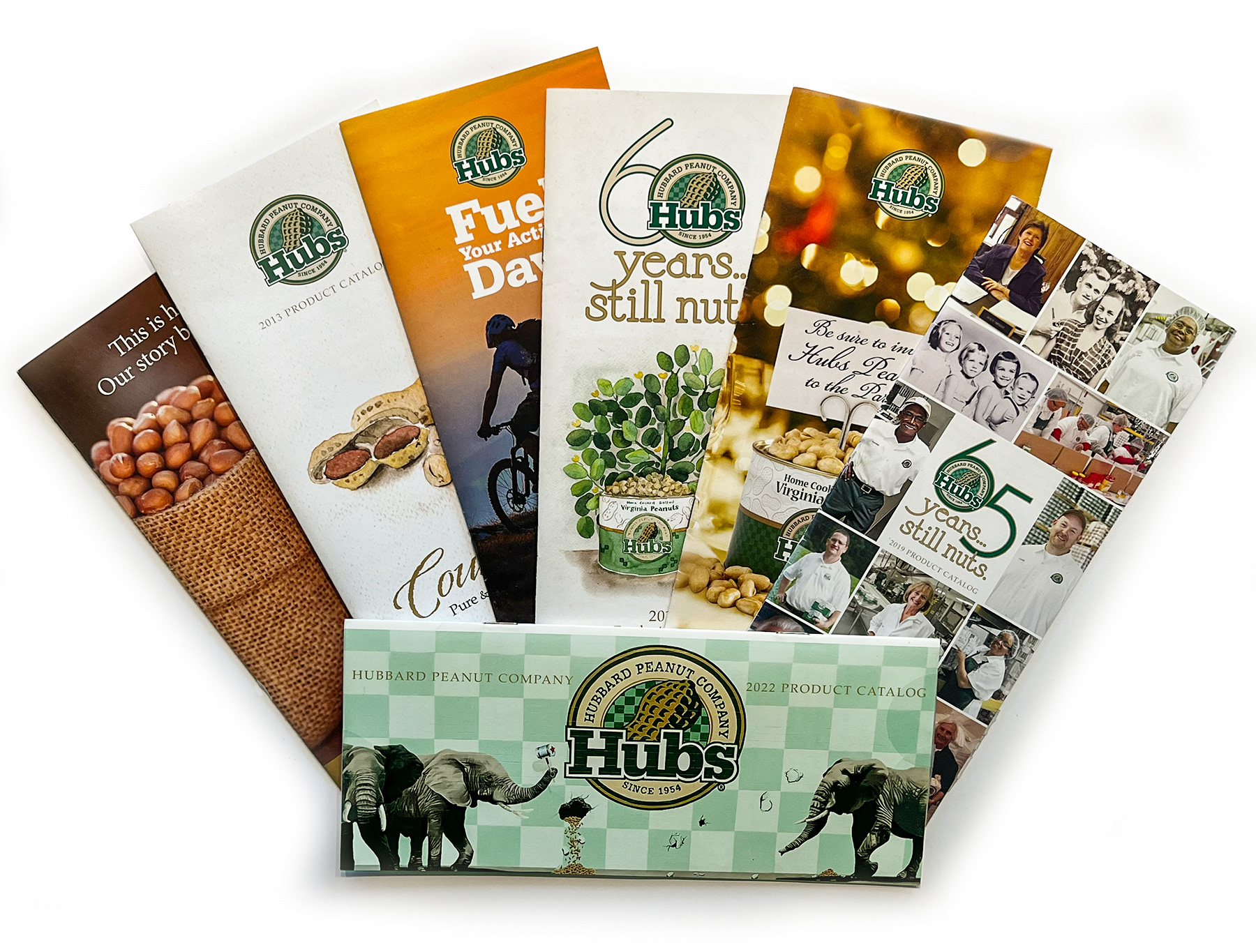 Hubbard Peanut Company began as a local provider of home cooked peanuts to neighbors. As the company grew into a worldwide supplier of peanuts, the catalog was developed to tell the Hubs story and provide customers with a way to view and order products. Today, the catalog is produced in both traditional print and digital versions.